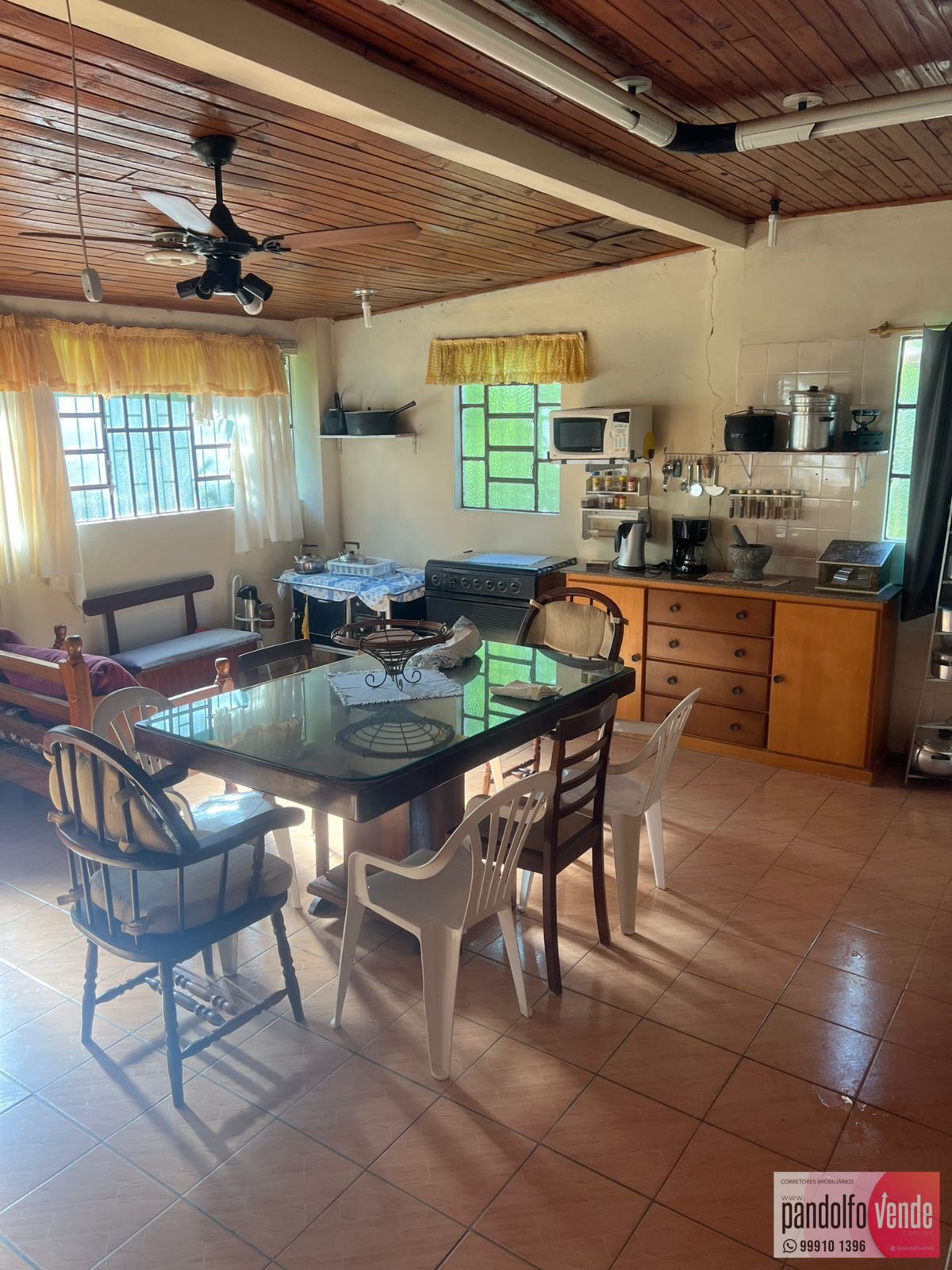 suíte, dois banheiros sociais, sala de estar, sala de jantar e uma ampla cozinha.
